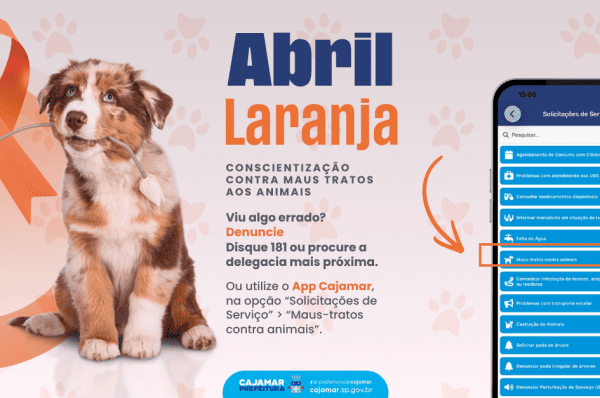 Campanha destaca a importância do respeito aos animais e orienta população sobre como agir em casos de violência A Prefeitura de Cajamar promove, durante este mês, a campanha Abril Laranja,